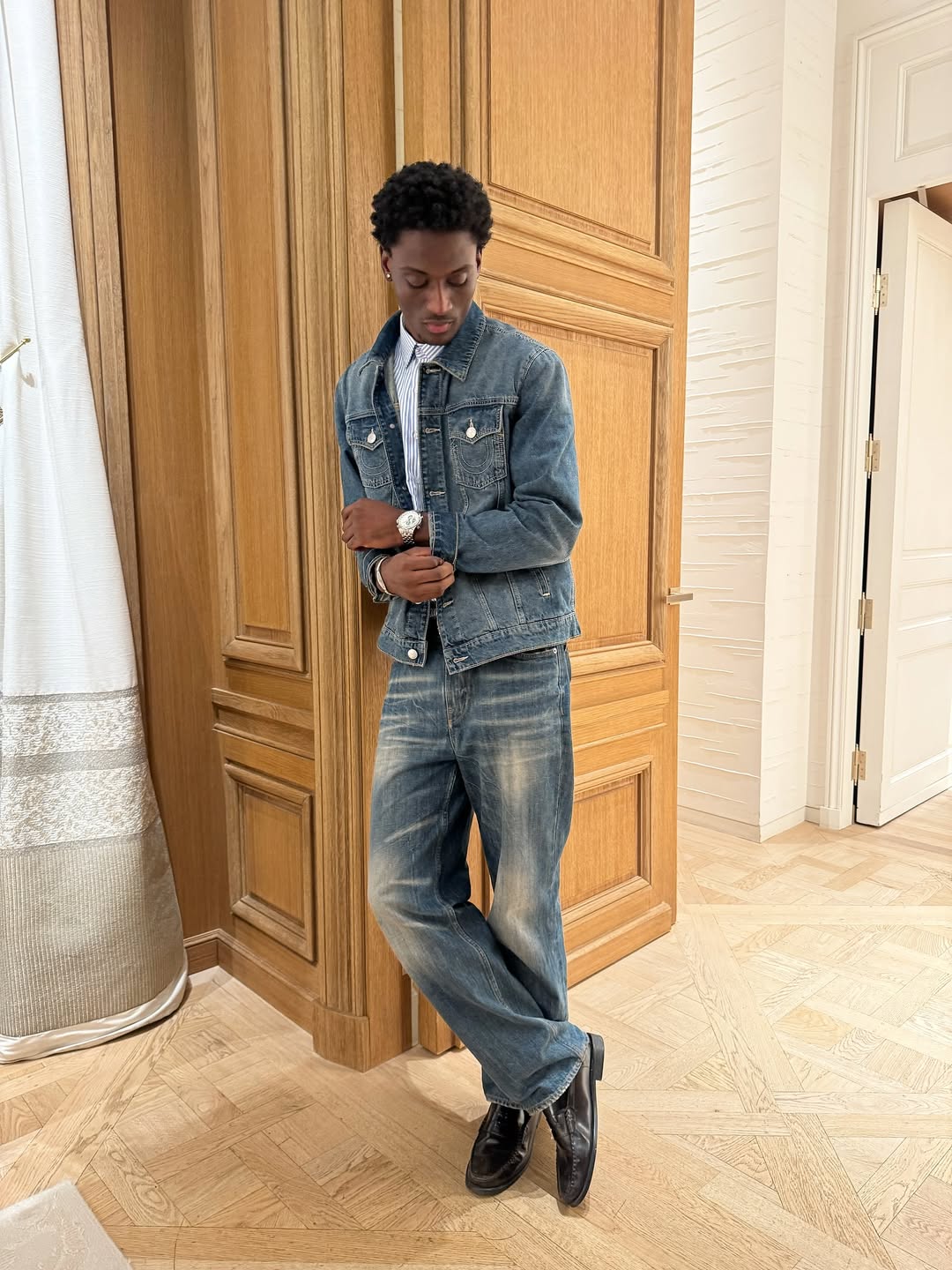 Double denim doesn’t have to scream rebellion. In darker washes or structured silhouettes, it becomes surprisingly sleek. A well-fitted denim jacket layered over a crisp tee or button-down, paired with matching jeans and leather shoes, exudes rugged confidence with evening polish. It’s perfect if you want to stand out without looking performative. Simply put, it’s laid-back enough for mingling, yet sharp enough for corporate photo ops.